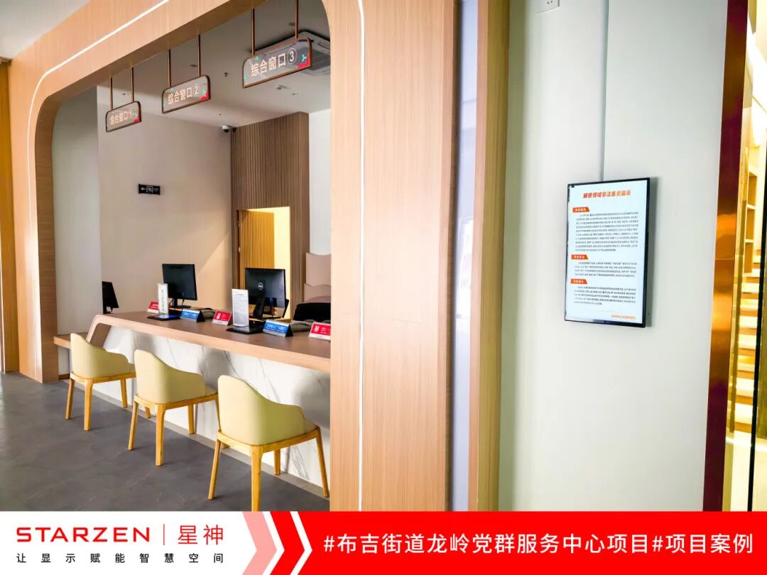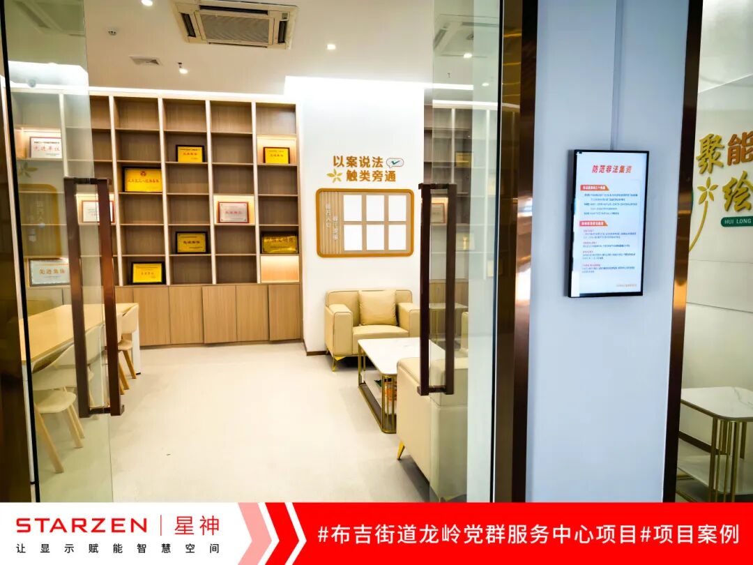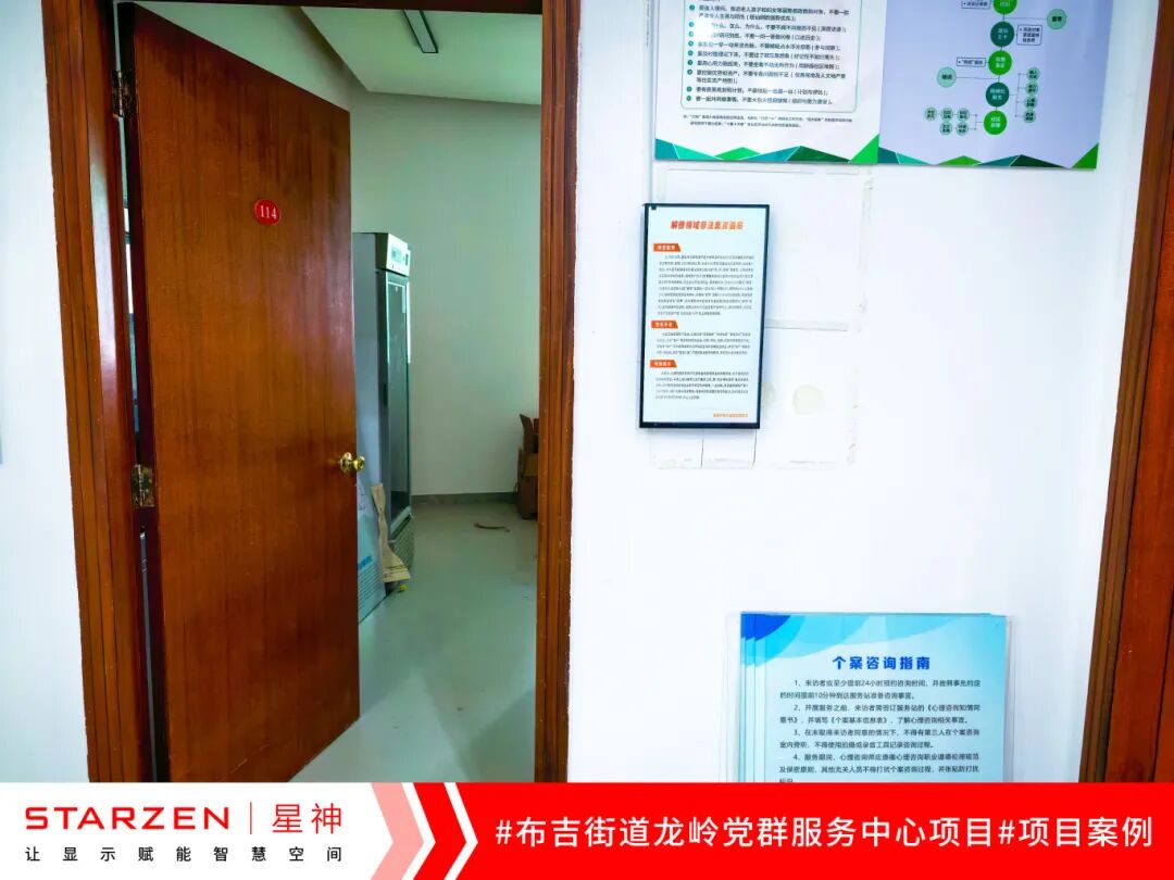 针对龙岭党群服务中心的核心需求,星神以自主研发的信息发布解决方案,搭配21.5寸竖屏窄边智慧门牌,实现多场景、全方位的智慧服务覆盖。